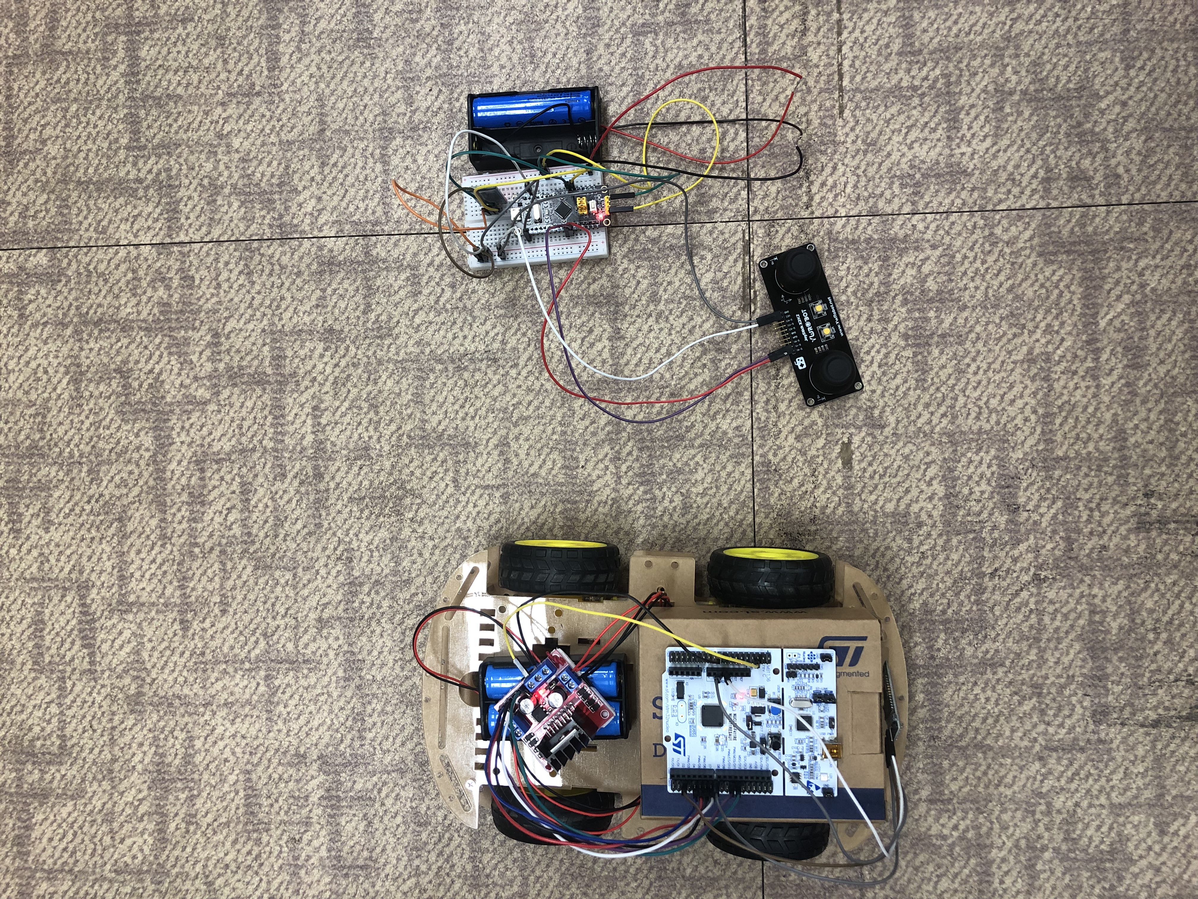 stm32로 각 모듈들 제어, 블루투스와 stm32는 uart로 통신, 두개의 stm32는 블루투스를 통한 무선 통신