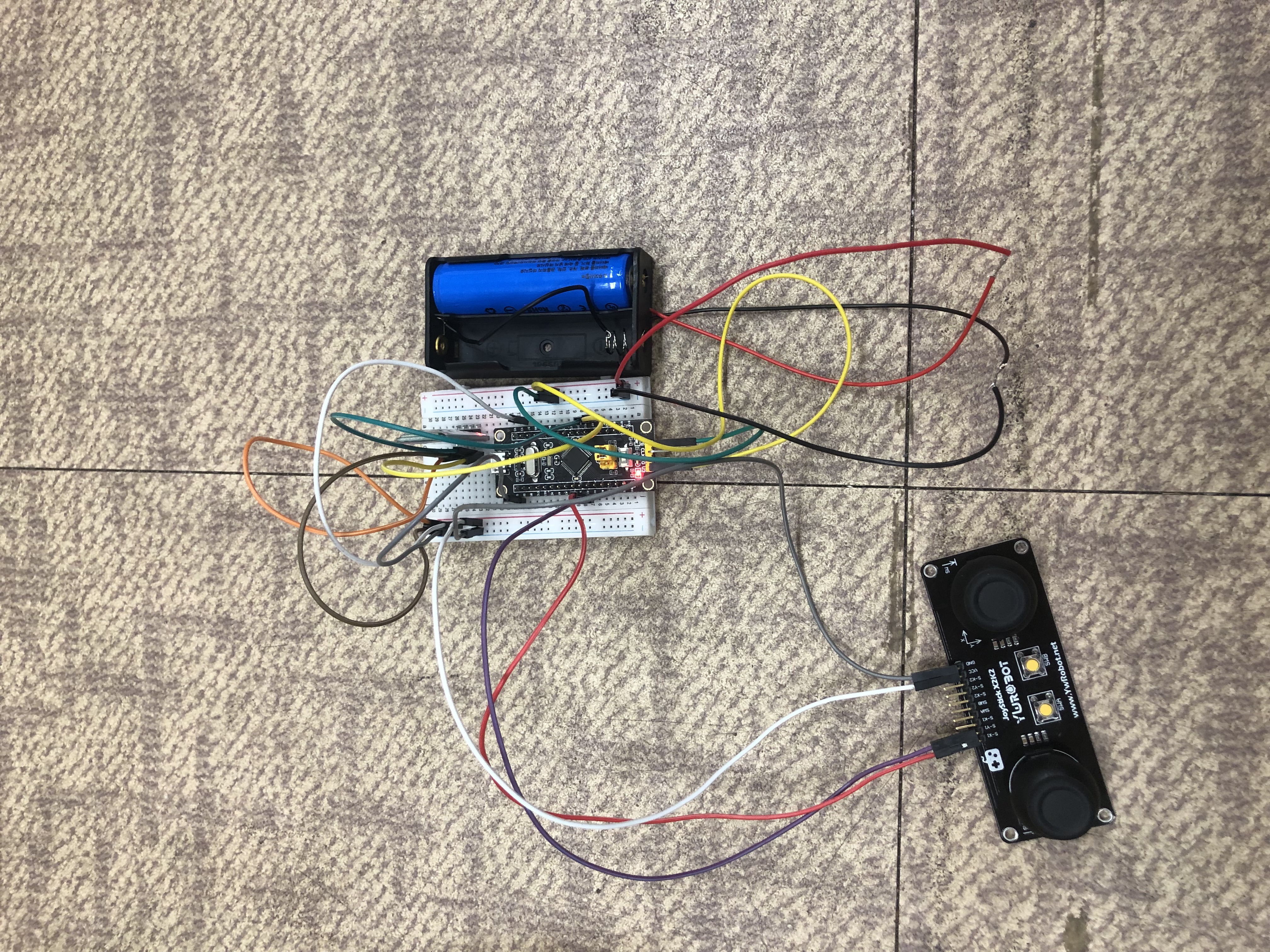 조이스틱용 stm32와 조이스틱, 블루투스 연결 코드작성 완료되면 배터리 1개를 사용한 외부전원으로 전원 인가