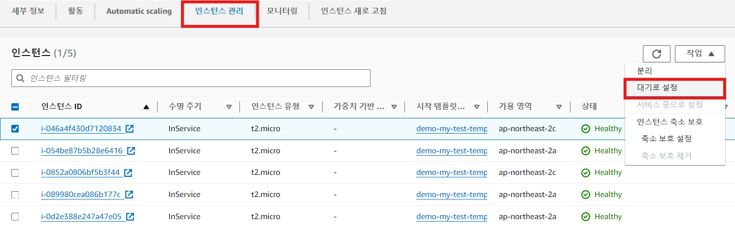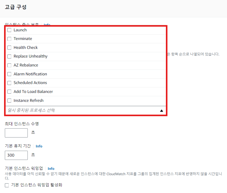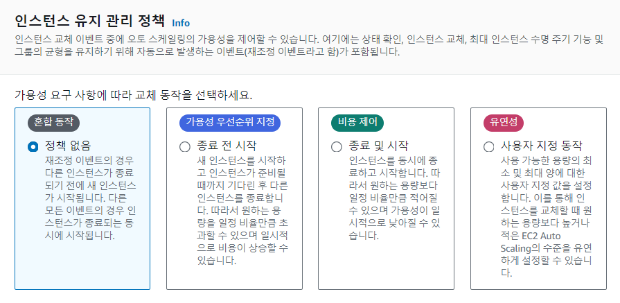- 커스텀: 가장 예전 시작 템플릿 부터, 가장 오래된 인스턴스부터, 가장 최근 인스턴스부터 등으로 커스텀 가능