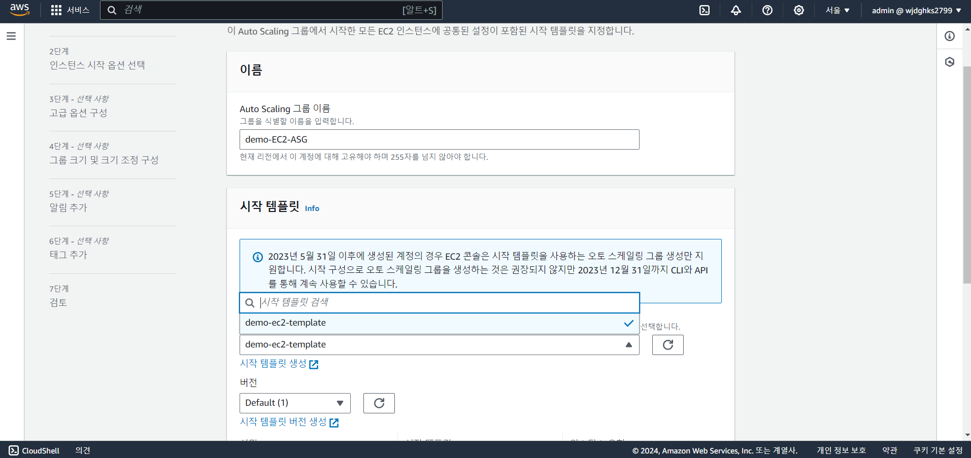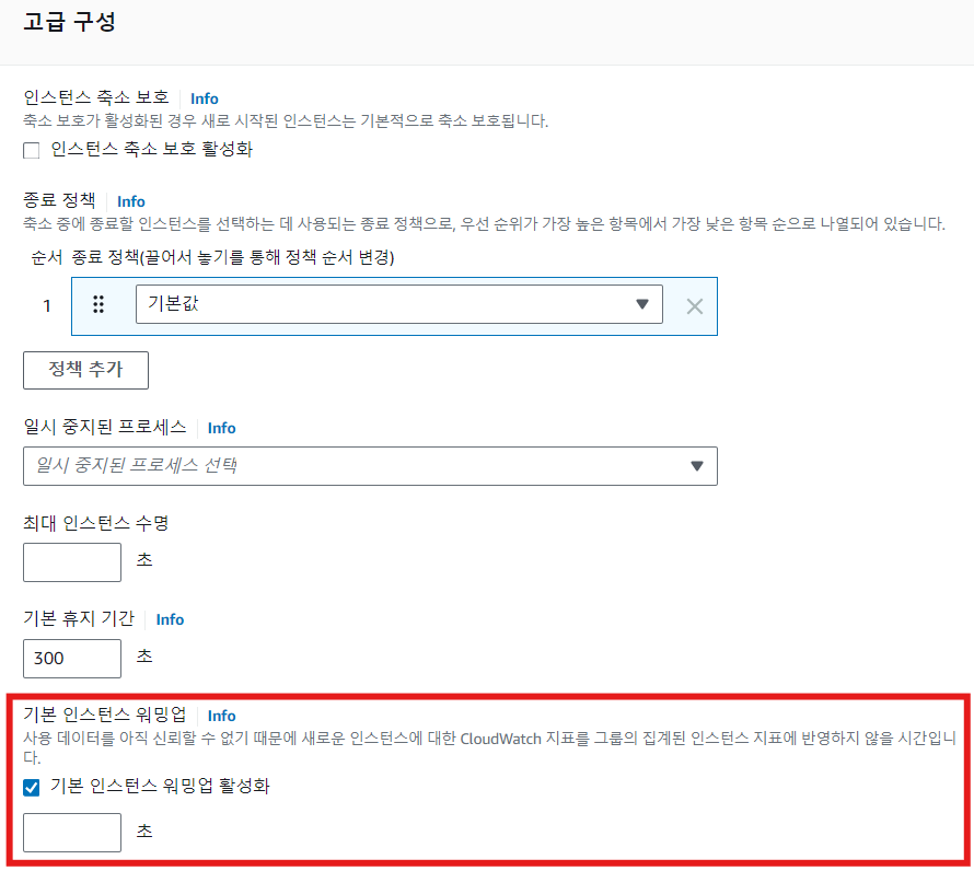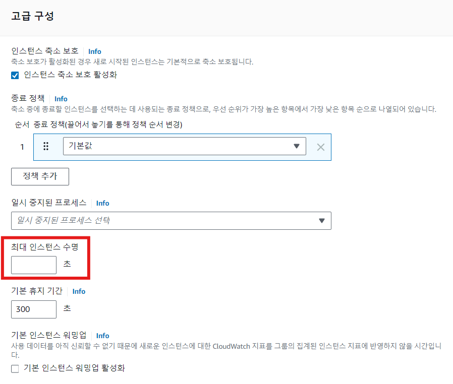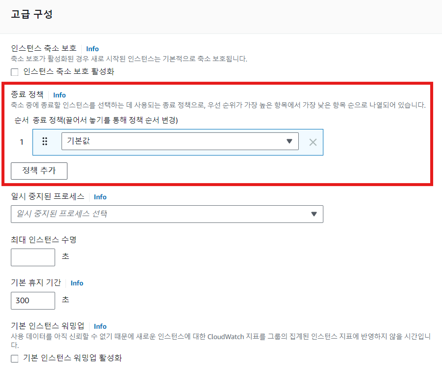 - 종료 정책: 인스턴스 숫자를 줄일 경우(Scale-in) 어떤 순서로 인스턴스를 종료시킬지에 관한 정책