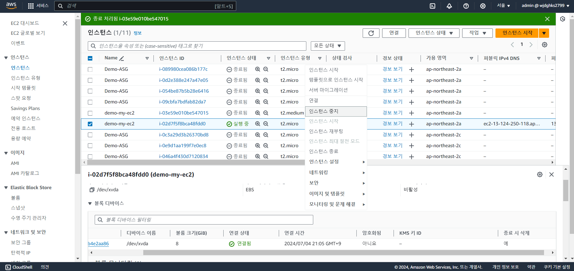 - 인스턴스 상태(서비스 중, 종료, 멈춤 등)