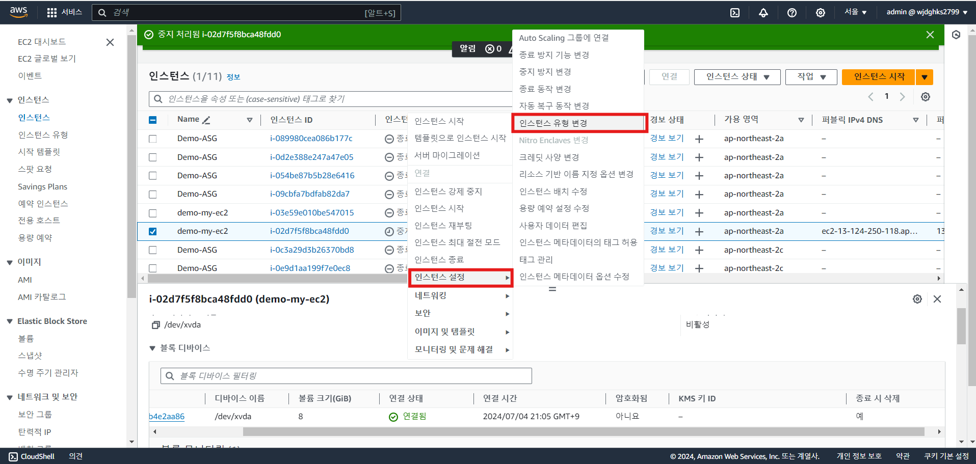- 사이즈 변경: 같은 인스턴스 패밀리에서 사용량에 따라 크기 조절(예: t3.micro -> t3.medium)