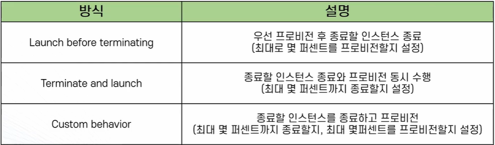 - 기본: 인스턴스가 2개 이상인 가용영역의 인스턴스에서 가장 오래된 시작 템플릿을 종료하고, 모두 같은 시작 템플릿이라면 다음 과금 시간에 가장 가까운 인스턴스를 종료