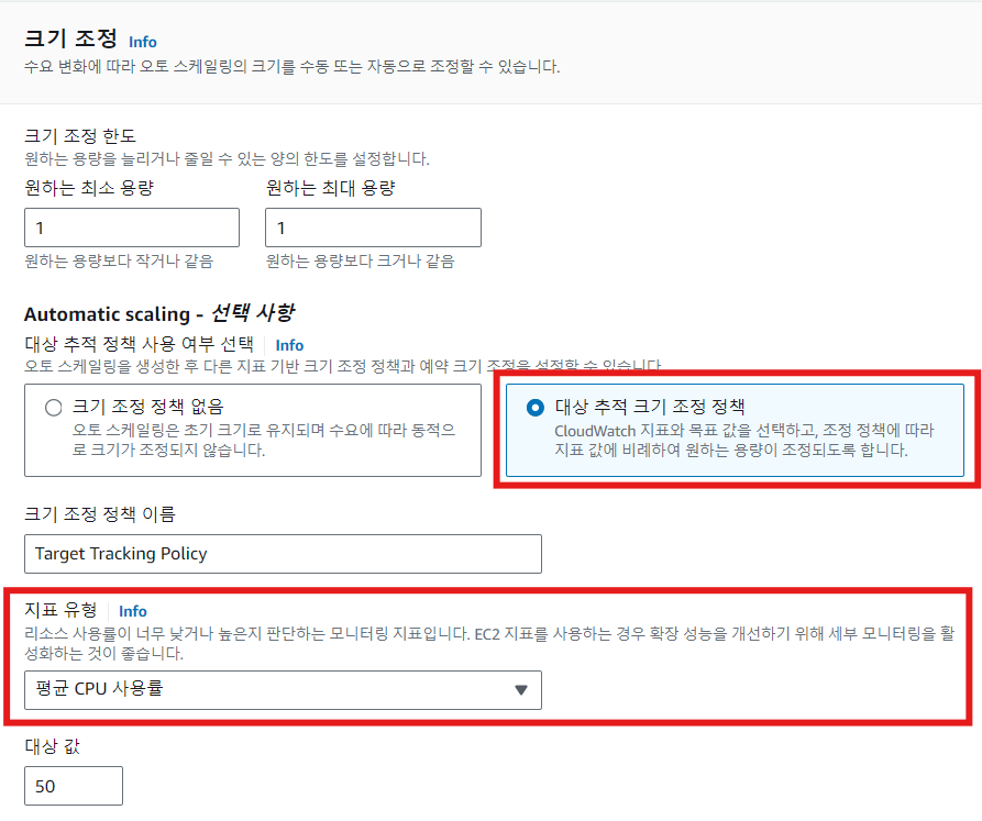 - 주로 AutoScale에서 지원하는 추적 조정 정책(target Tracking Policy) 활용