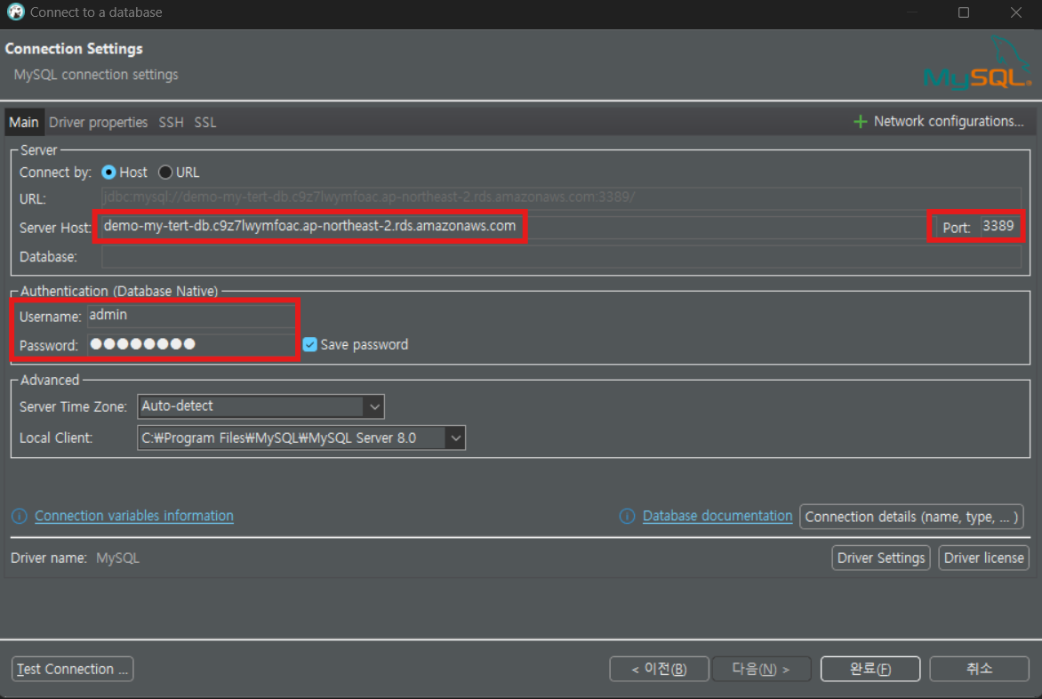 ※ Server Host: RDS 엔드포인트