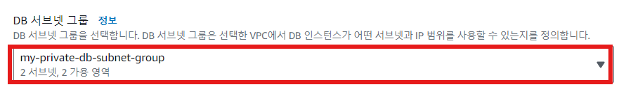 c. RDS 데이터베이스 생성 시 생성한 서브넷 그룹 선택