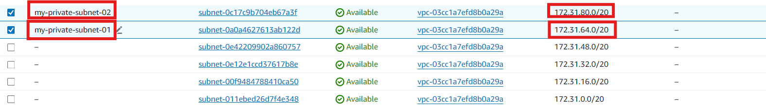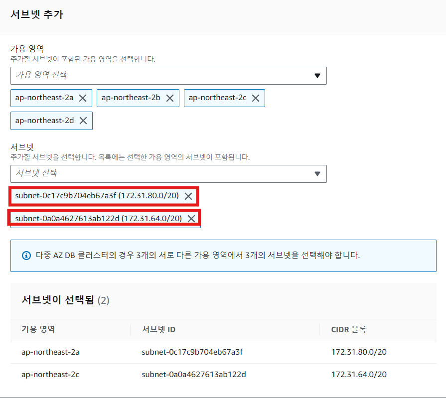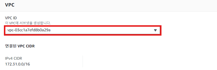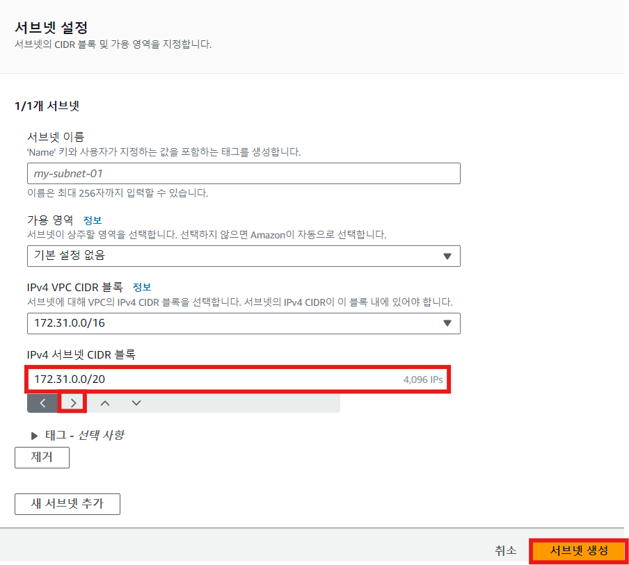 ※ CIDR 블록에 기본 VPC 서브넷의 CIDR을 입력하여 > 버튼을 눌러 기본 서브넷과 분리된 서브넷을 생성