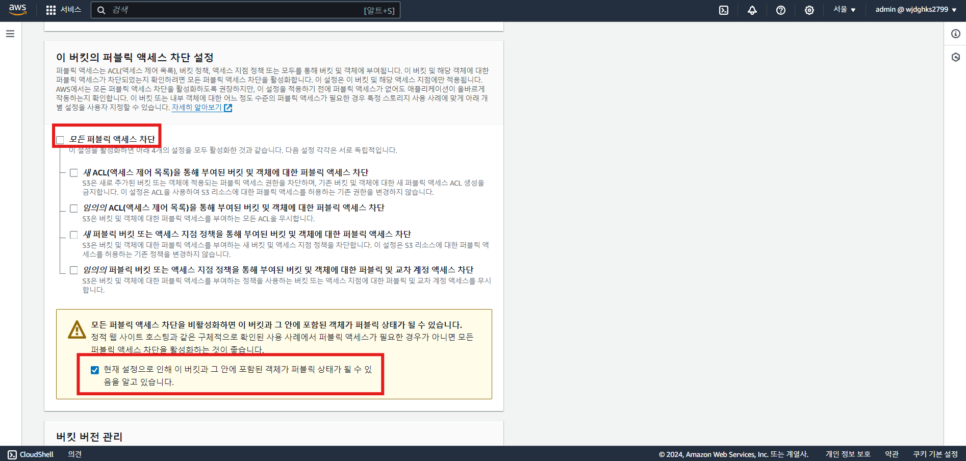 - 버킷 생성 시 퍼블릭 액세스 차단 해제