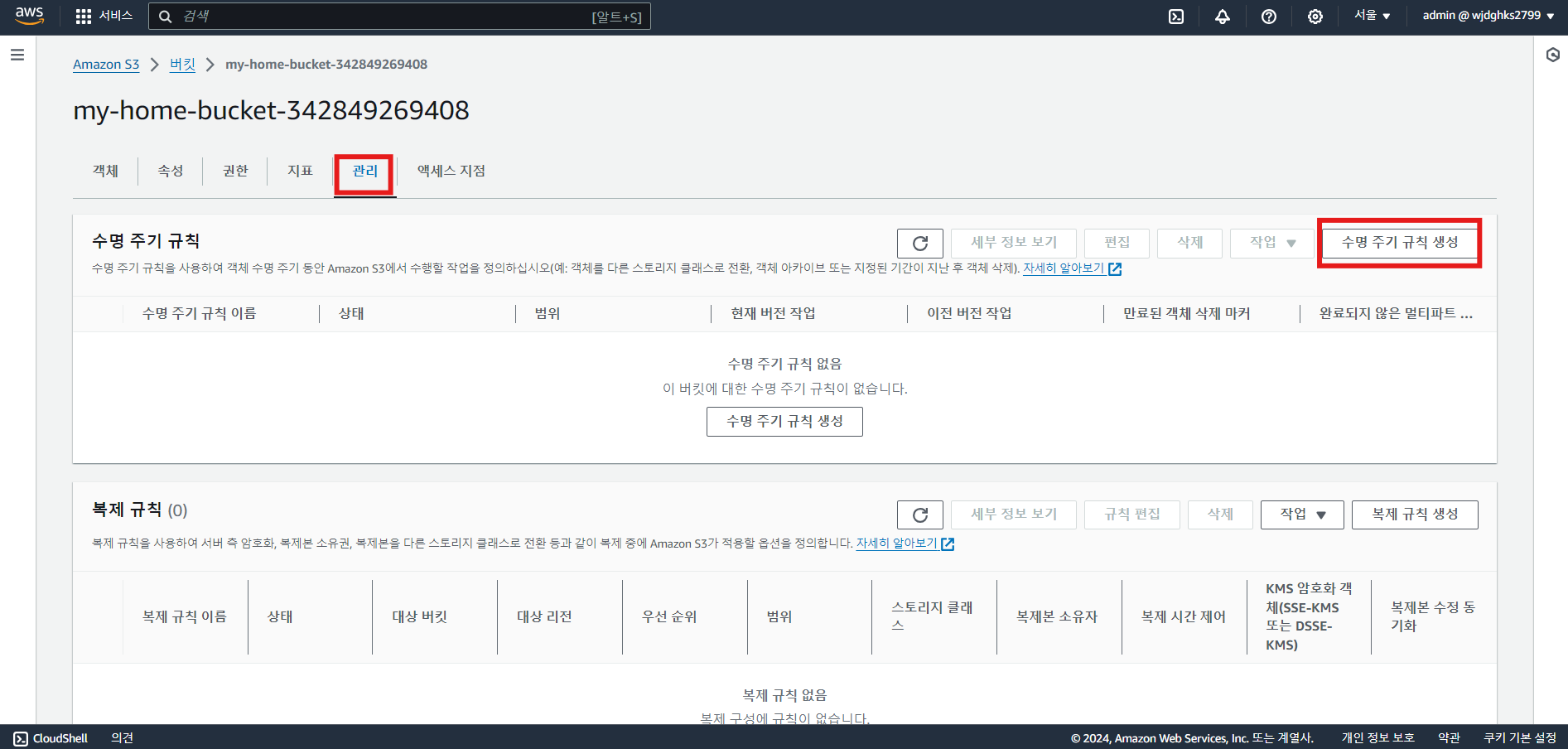 - 복제(Replication): 지정 S3 버킷의 변경 내역을 다른 버킷으로 비동기로 복제하는 기능