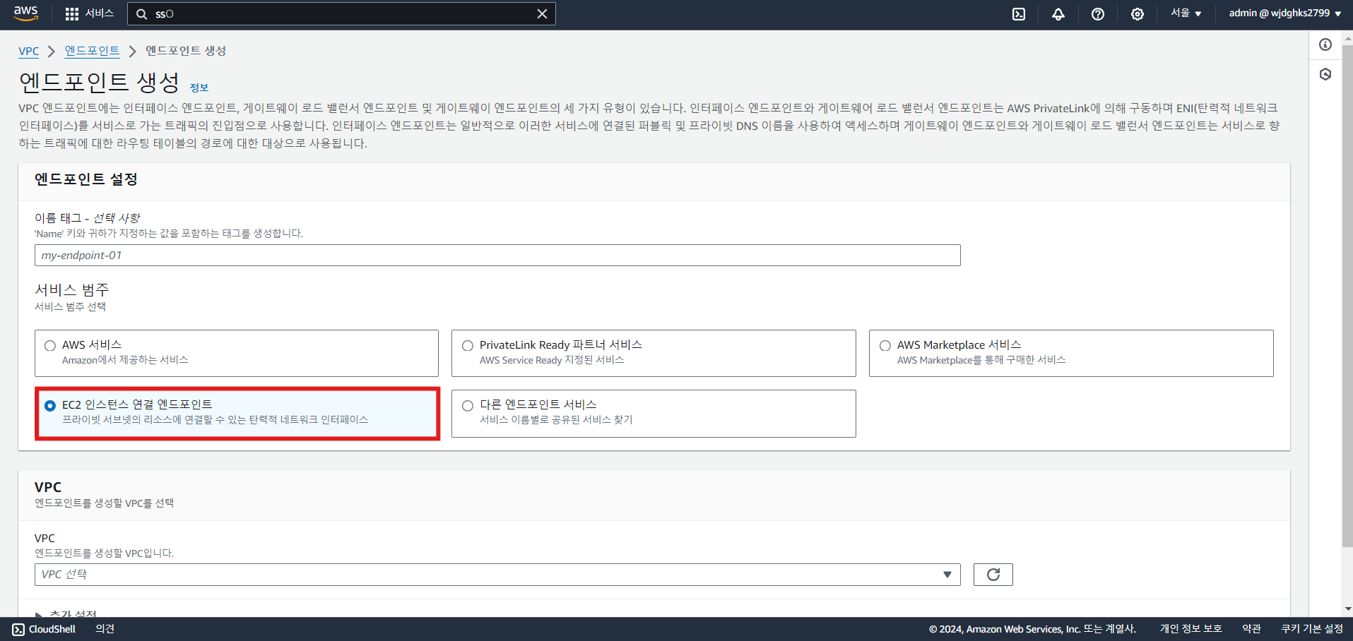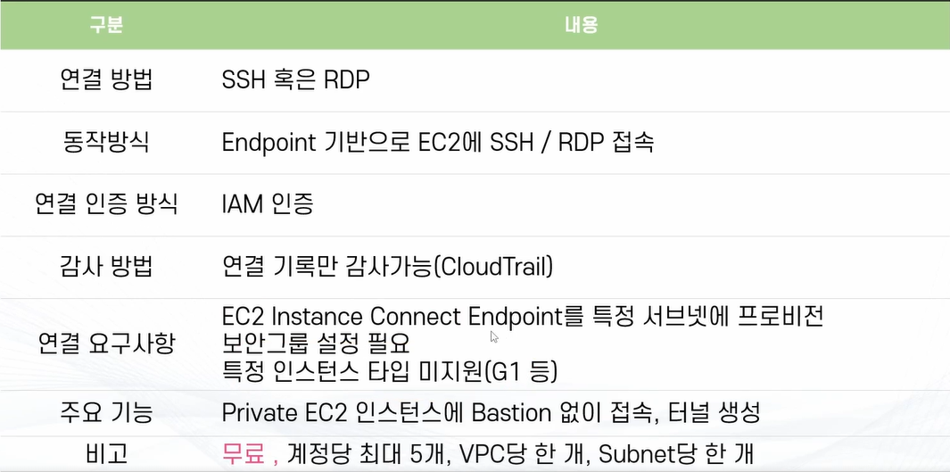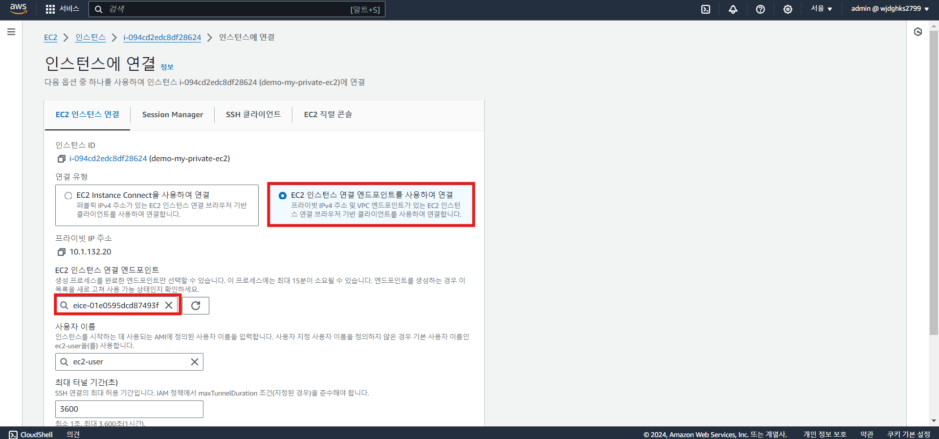 - 인스턴스 연결 시 EC2 인스턴스 연결 엔드포인트를 사용하여 연결