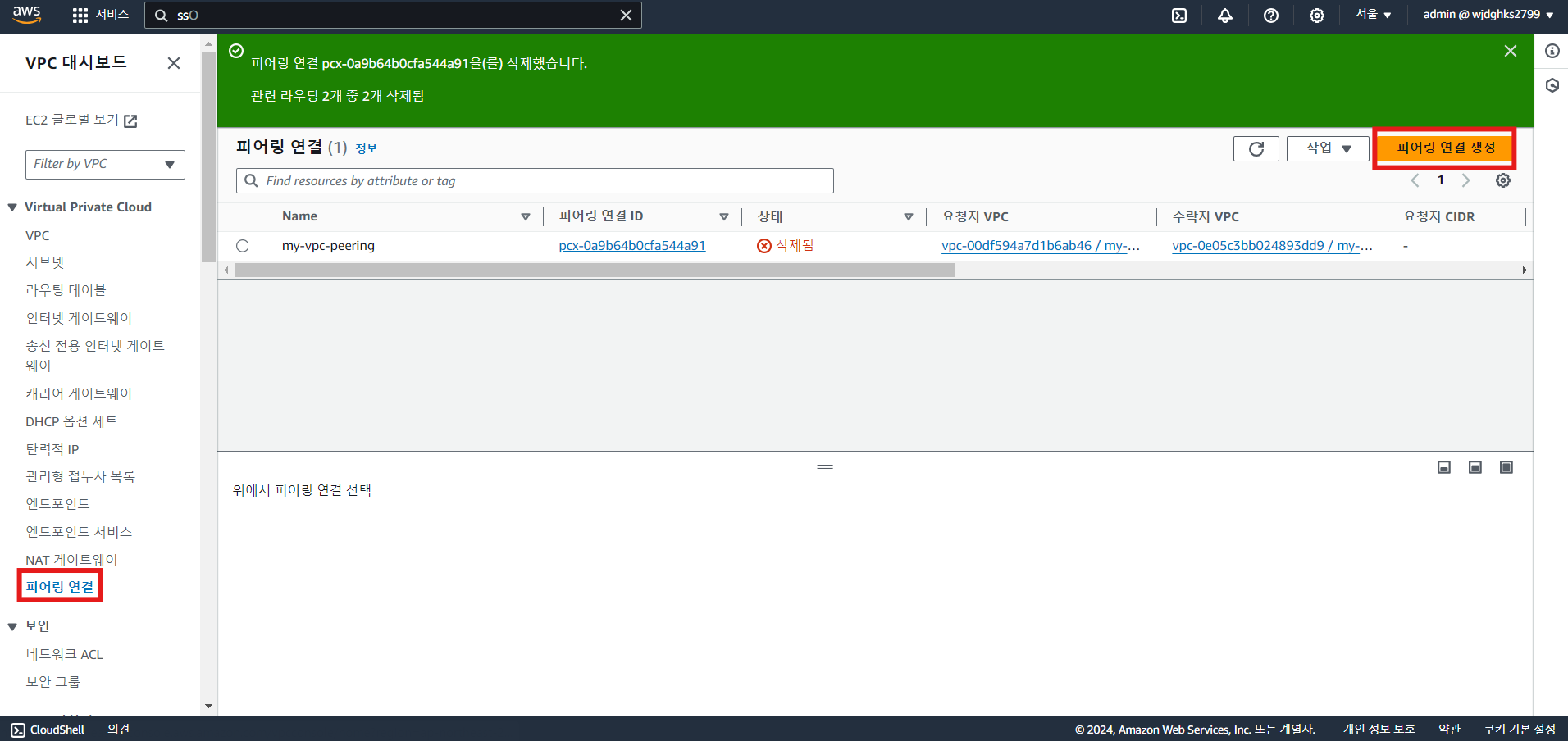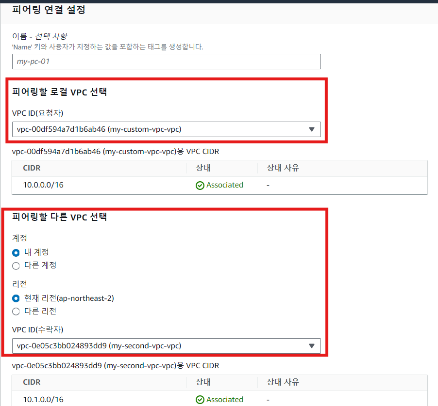 - 두 개의 다른 VPC를 연결하여 VPC 안의 리소스끼리 통신이 가능하고록 설정하는 것