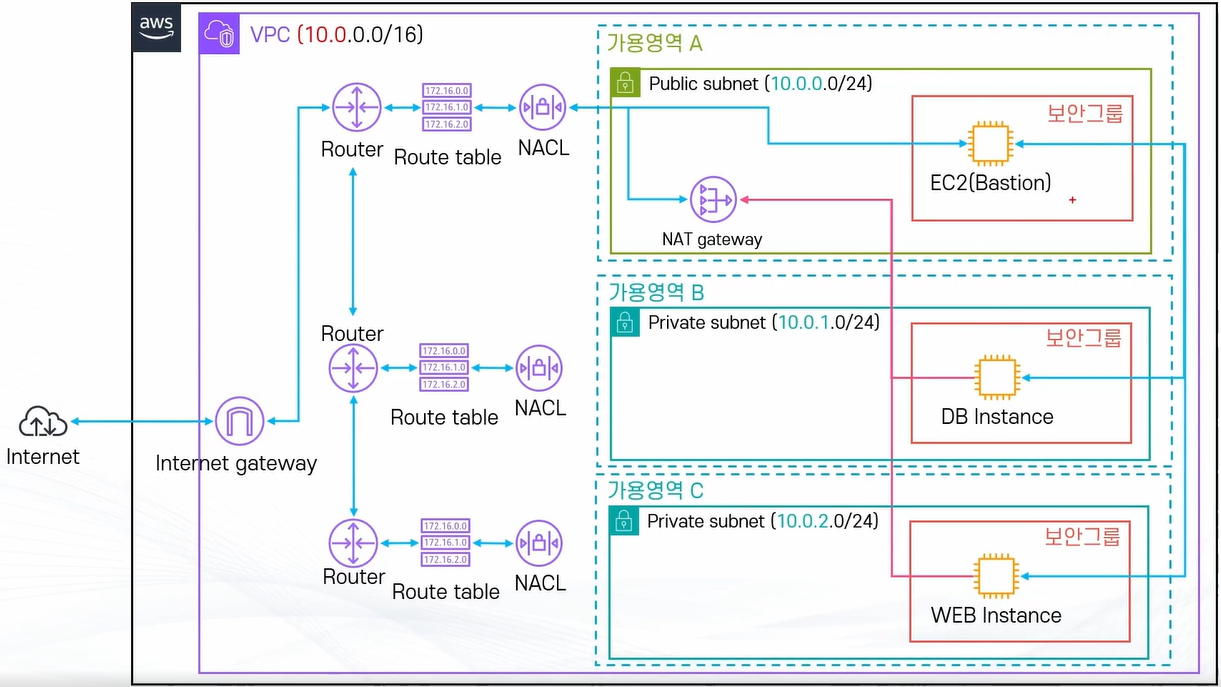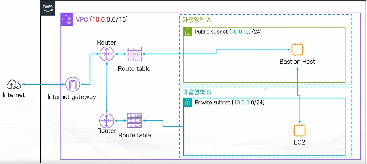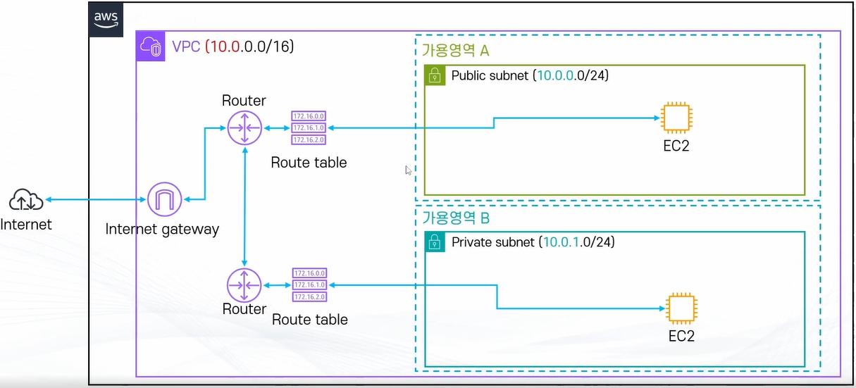 - 하나의 서브넷은 하나의 가용영역(AZ) 안에 위치