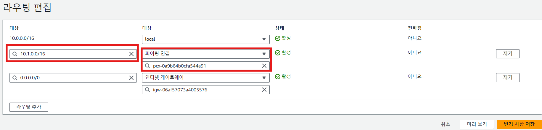 - Peering 설정 이후 라우팅 테이블을 업데이트해서 경로 설정 필요