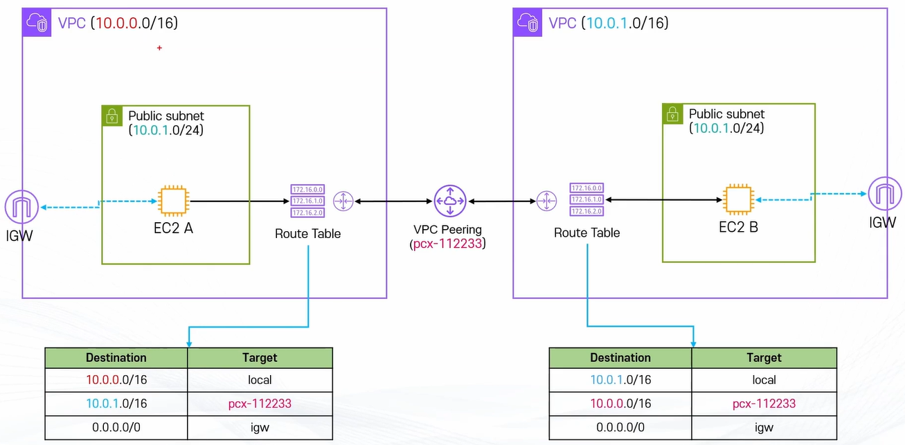- VPC Peering을 위해서는 서로 IP Range가 겹치지 않아야 함