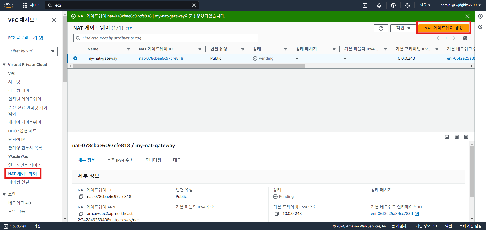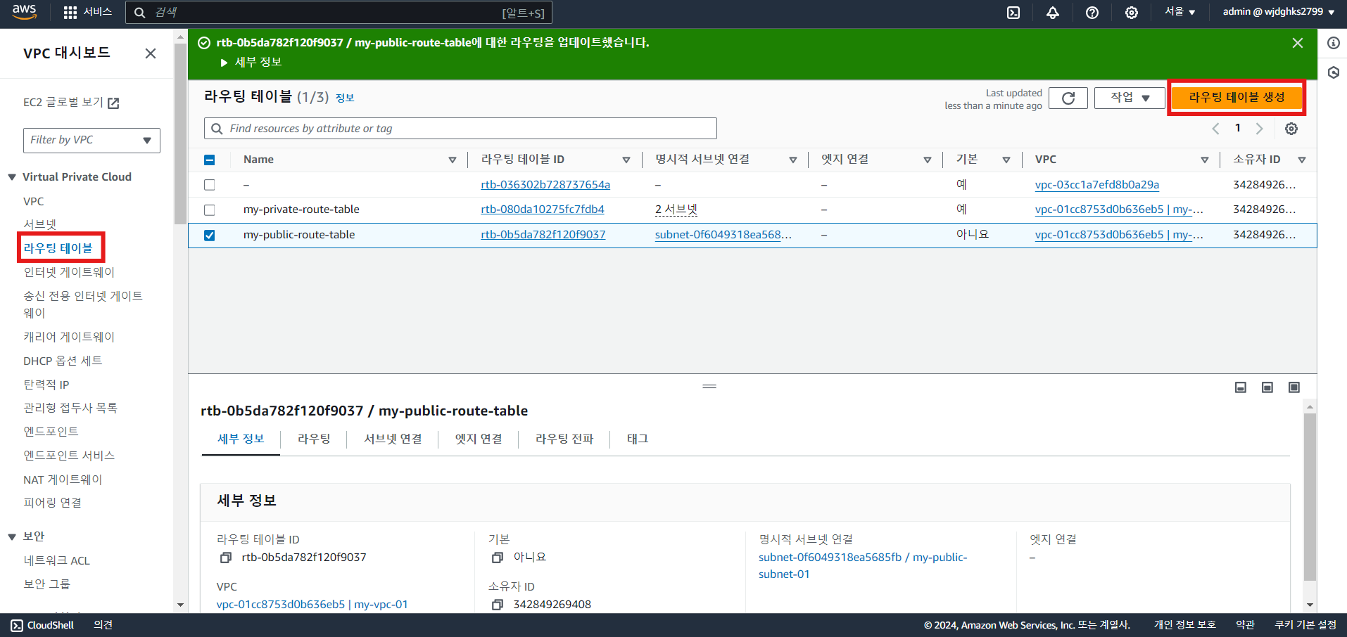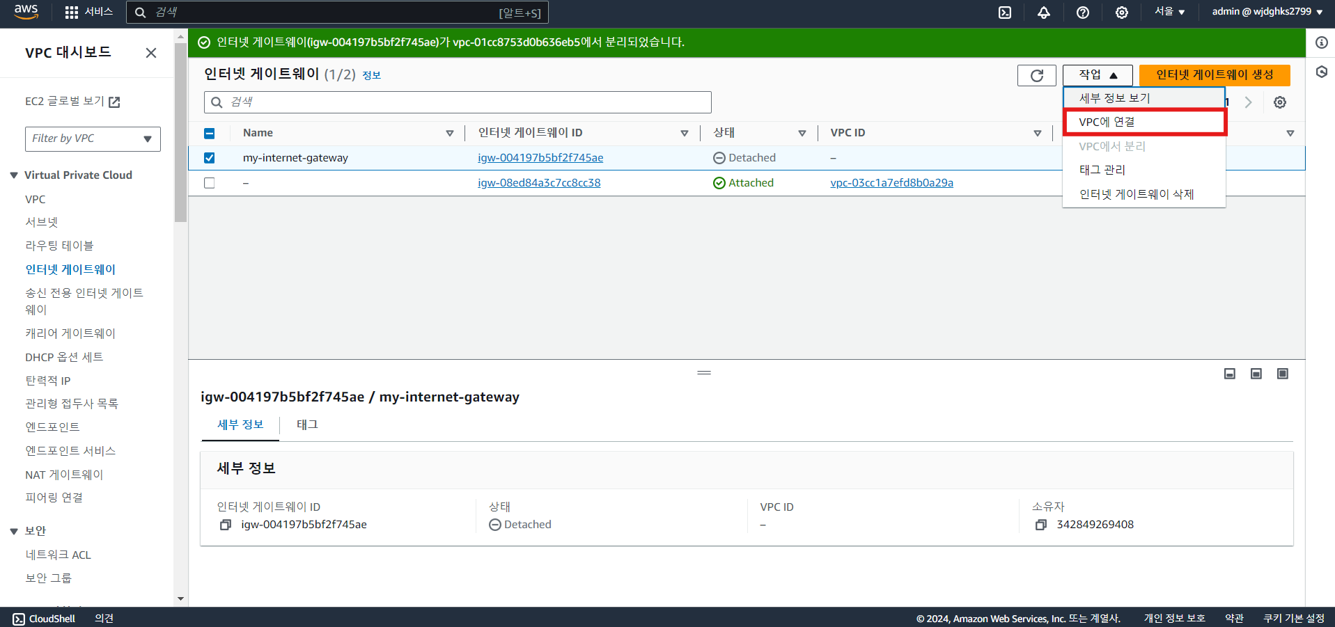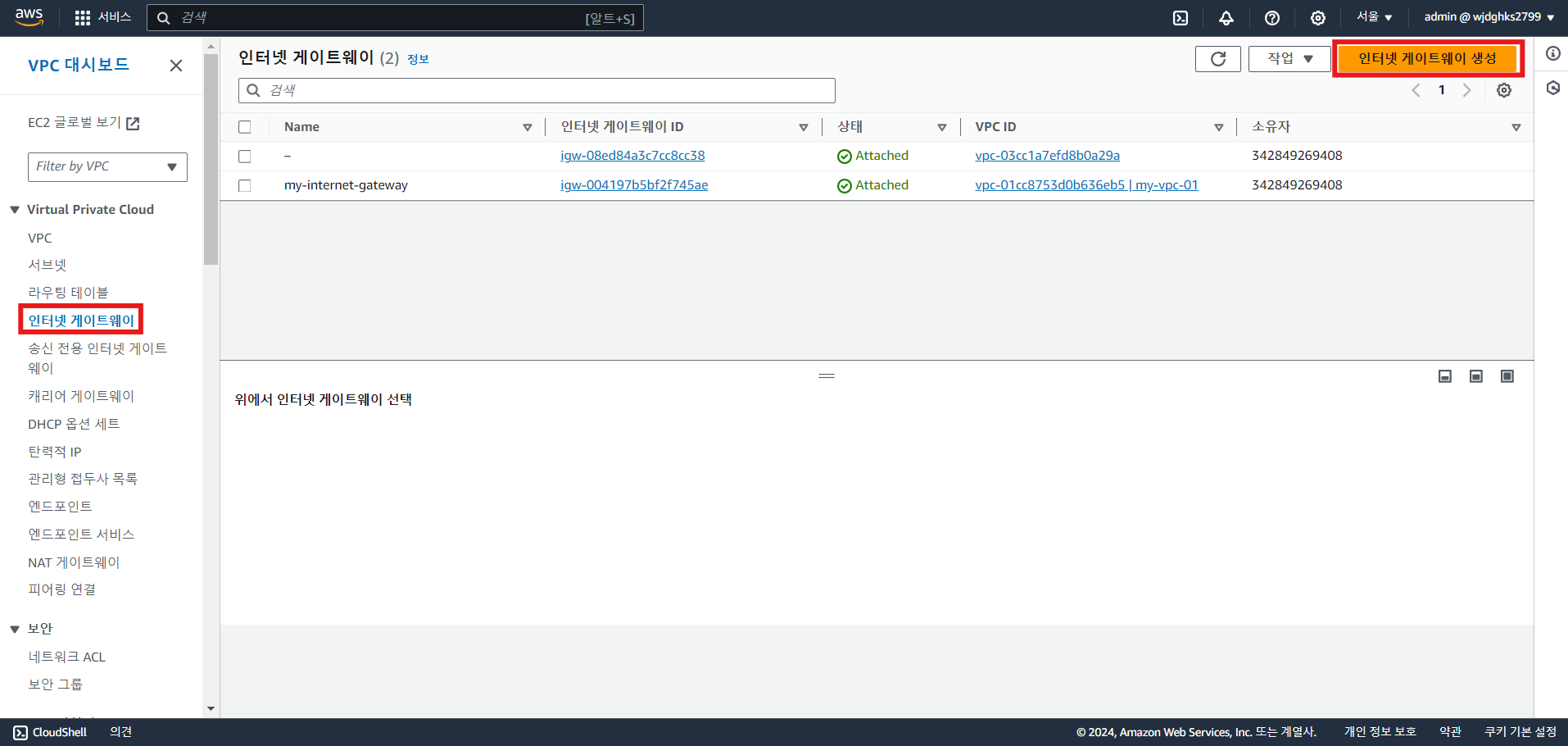 - 인터넷 게이트웨이(IGW)를 통해 외부의 인터넷과 연결되어 있음