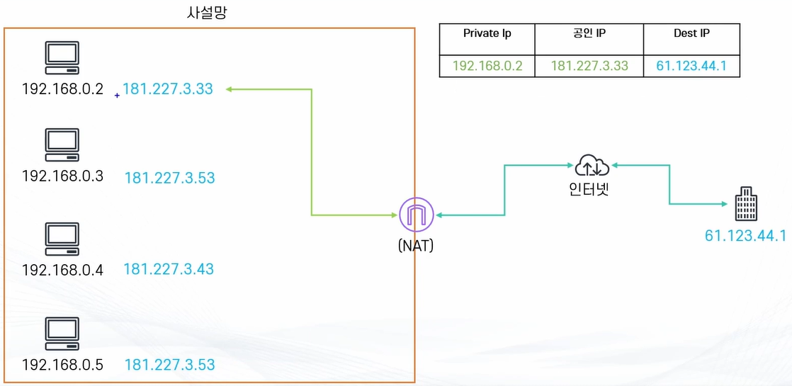 - 사설망 내부에는 외부 인터넷 망으로 통신이 불가능한 사설 IP로 구성