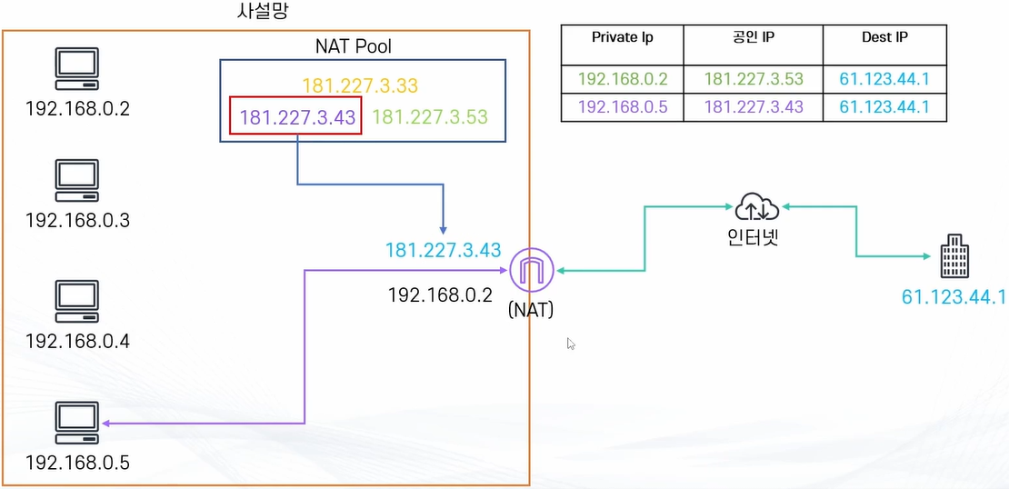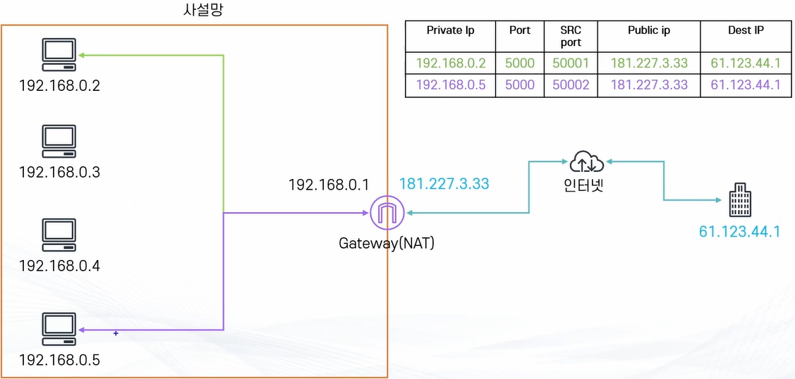 - 많은 사설 IP를 하나의 공인 IP로 연결