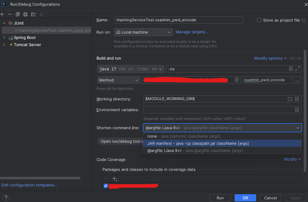 run command 길이가 OS limit를 넘으면 실행할 수 없게 된다고 한다. 이를 해결하기 위해서는 Run/Debug Configuration에서 Shorten command line의 옵션을 수정해야 했다.