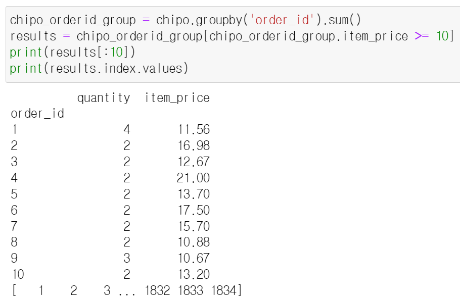 - groupby()를 사용하여 order_id 피처를 기준으로 그룹을 만들어 quantity, item_price의 합을 계산함