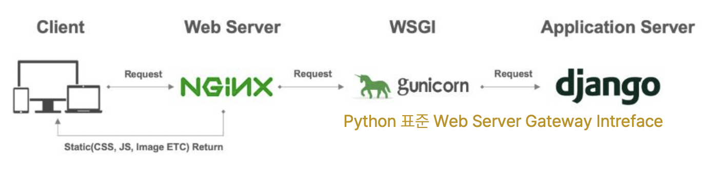 Gunicorn은 Python WSGI로 웹서버 NGINX로부터 서버사이드 요청을 받으면 서버애플리케이션 Django로 전달하는 역할을 수행