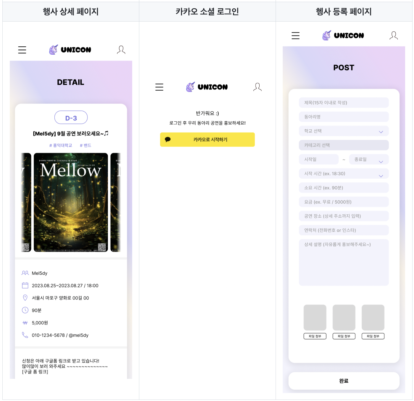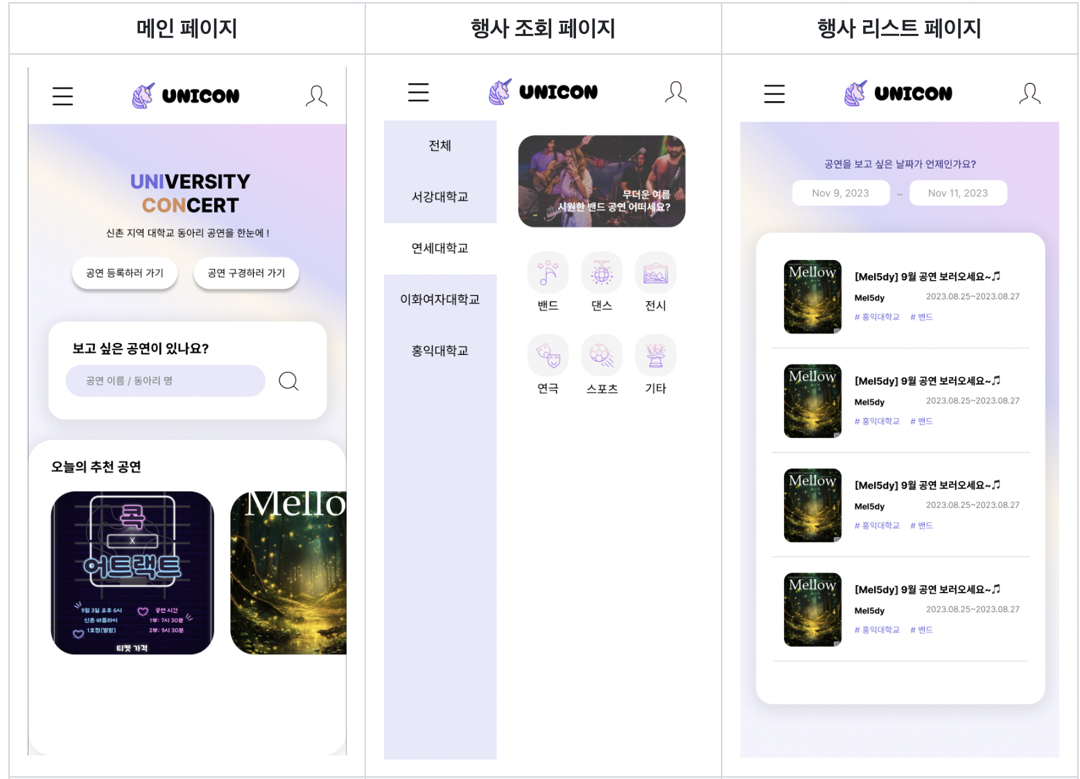 대학생 & 문화생활: UNICON은 대학교 동아리들의 공연, 전시, 행사를 간편하게 모아볼 수 있는 플렛폼입니다