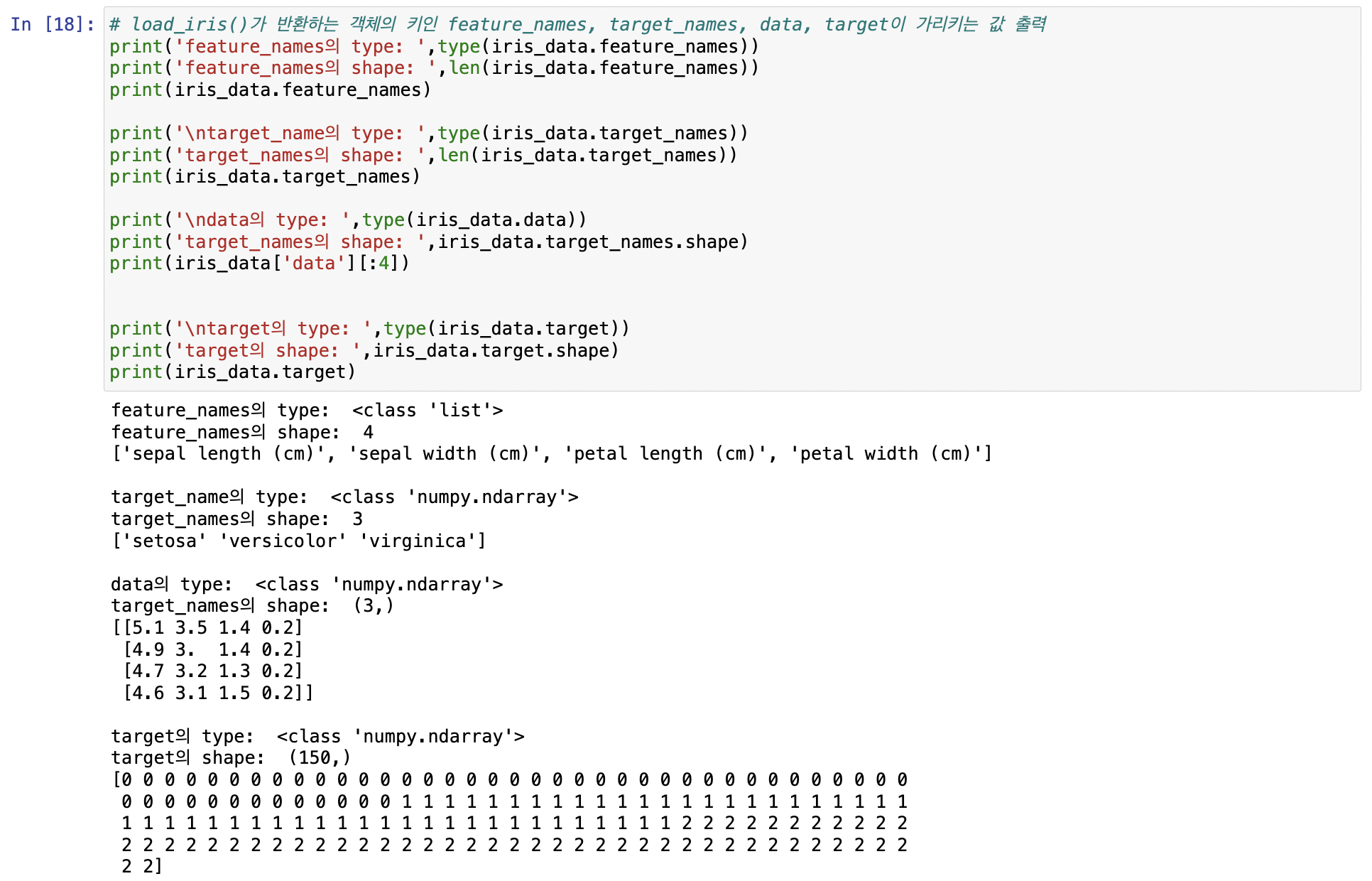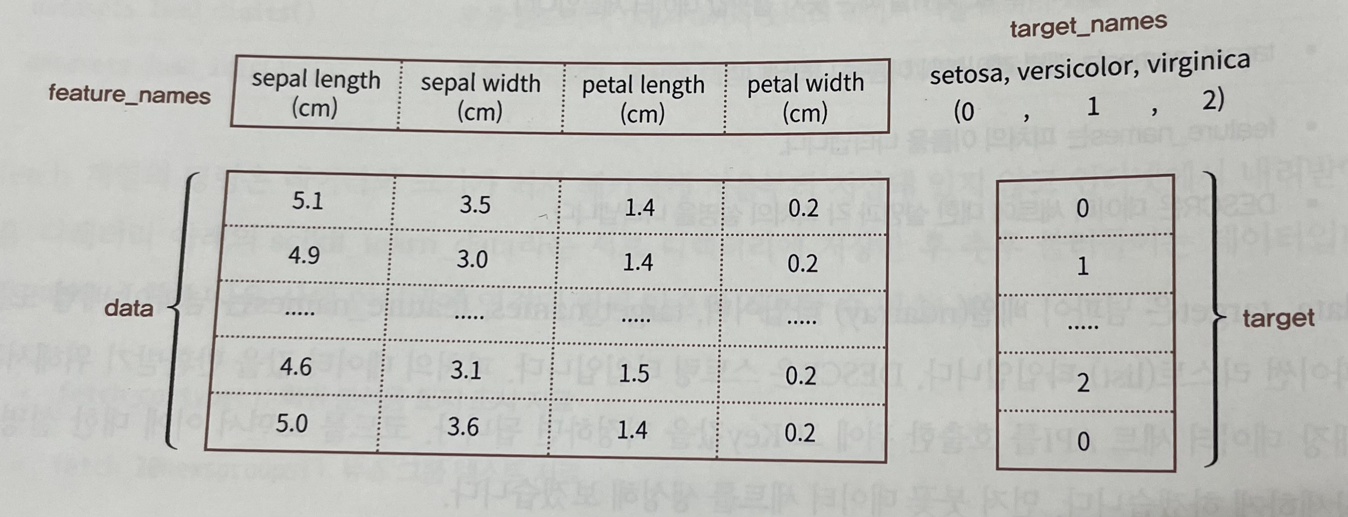 target : 분류레이블 값, 회귀숫자 결과값 데이터 세트 (넘파이 배열)