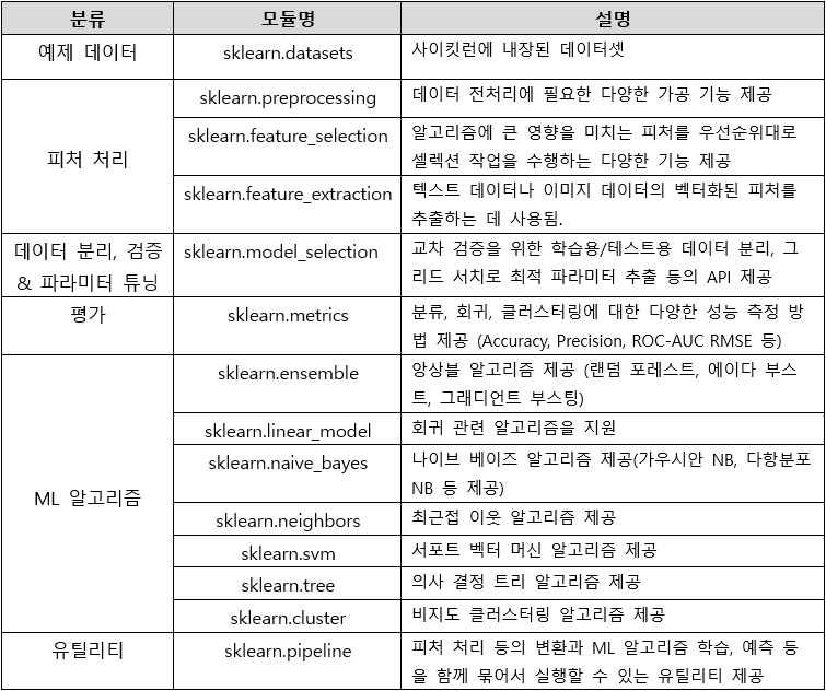 사이킷런에 외부 웹사이트에서 내려받을 필요 없이 예제로 활용할 수 있는 좋은 데이터 세트 내장됨