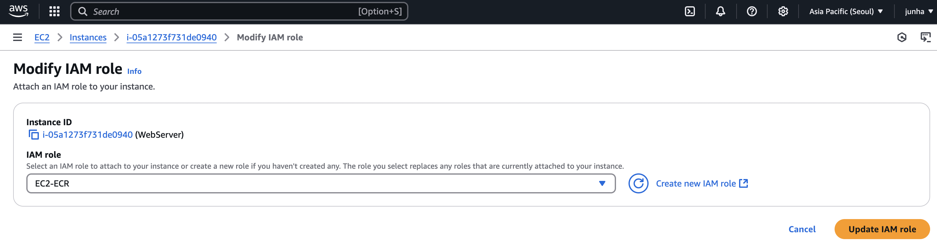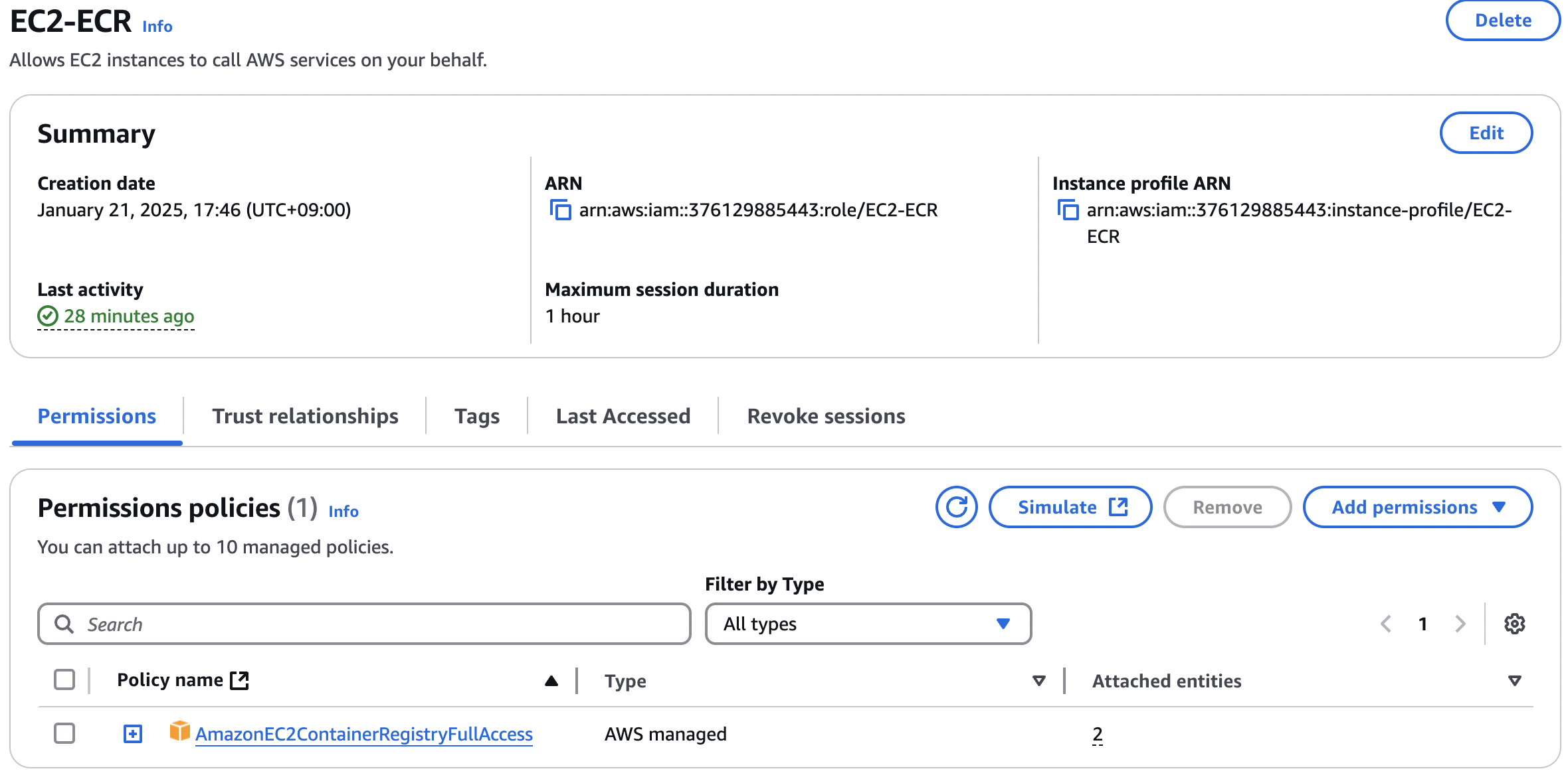 EC2 인스턴스가 ECR의 Private Repository에 접근하려면 적절한 정책이 설정된 Role 을 부여해야한다.