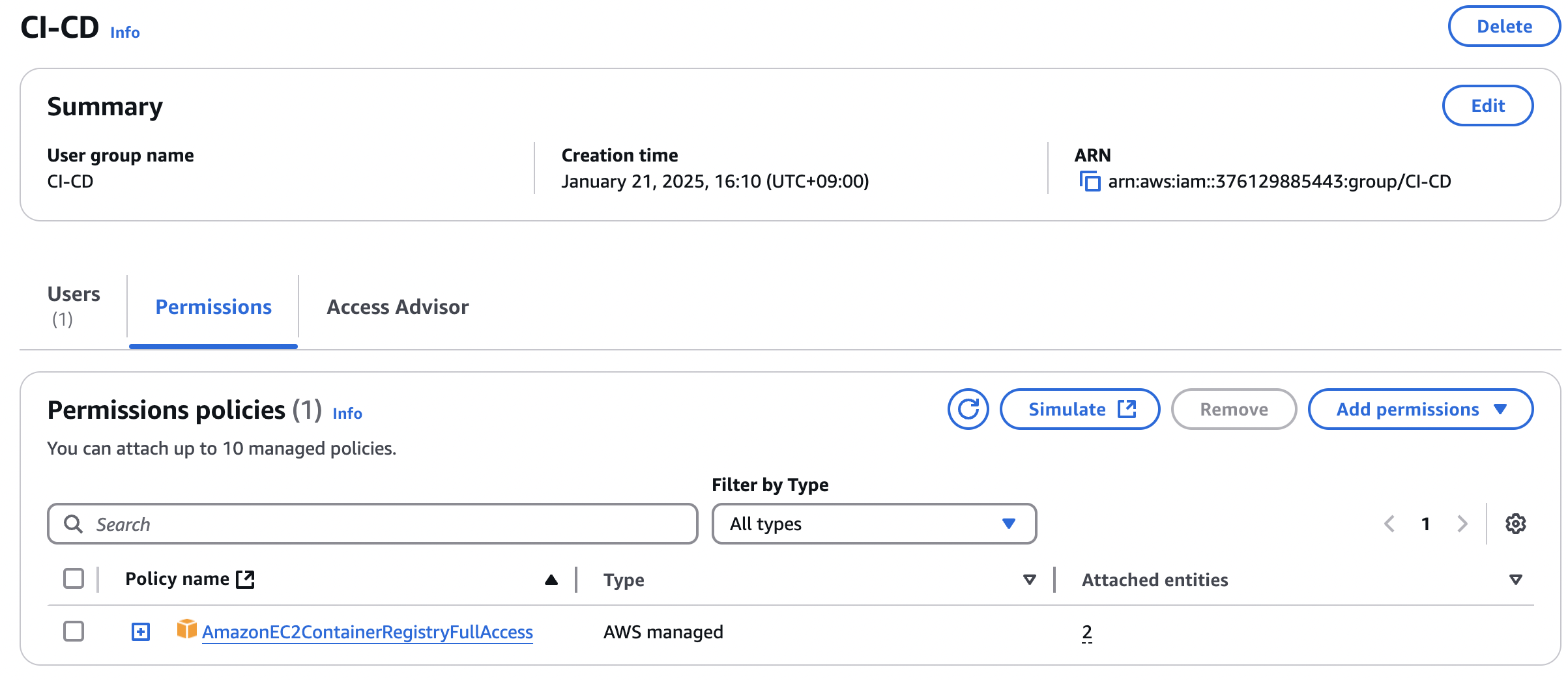 CI-CD 유저 그룹에는 AmazonEC2ContainerRegistryFullAccess