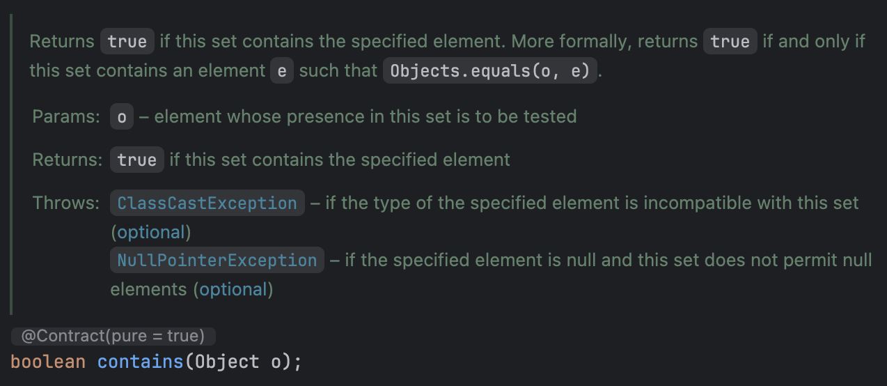 Set 인터페이스의 contains 메서드 설명을 보면, Objects.equals() 가 true일 때 중복된 원소임을 판단한다고 작성되어있다.