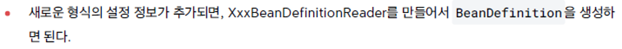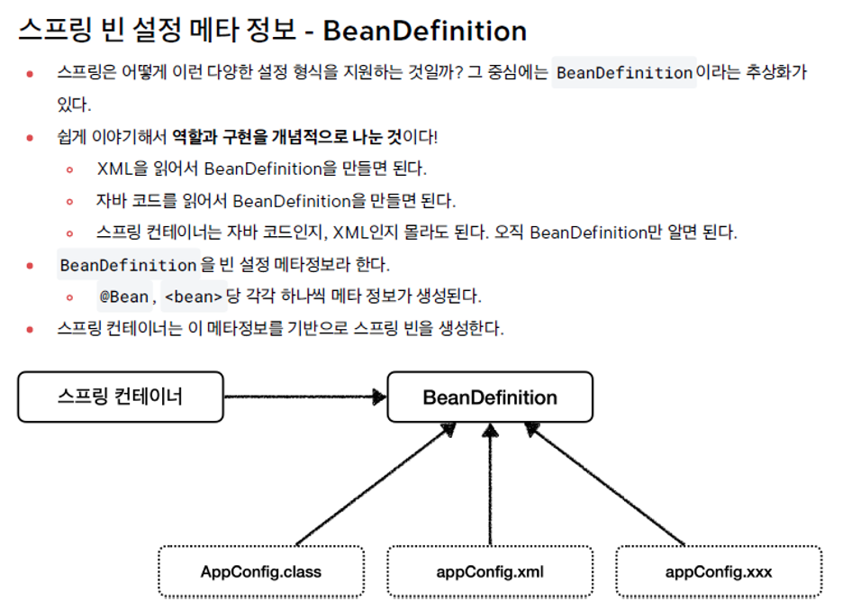 각각의 메타 데이터 형식이 BeanDefinition이라는 추상화를 만들어낸다. IoC 컨테이너는 이 BeanDefinition을 읽어들여 빈을 구성한다. 어떠한 메타데이터 형식이든 BeanDefinition만 구성이 가능하면 스프링 컨테이너를 동작시킬 수 있다.