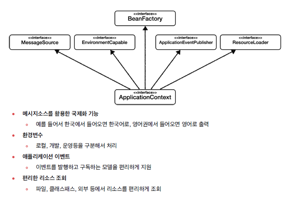 ApplicationContext는 BeanFactory외에도 국제화기능, 환경변수, 이벤트, 리소스 조회 등의 기능을 제공하는 다양한 인터페이스를 상속받는다.
