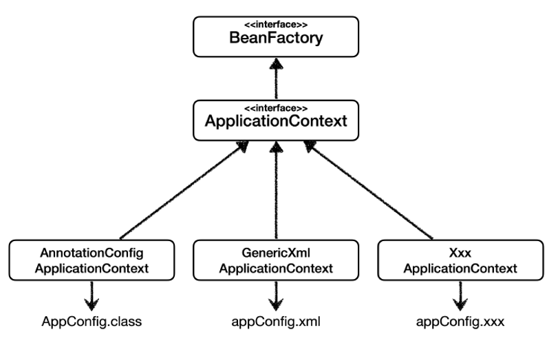 ApplicationContext를 구현한 구현체로 AnnotationConfig-, GenericXml-, 등이 존재하며 이는 각각 메타데이터를 구성하는 방식에 따라 나뉜다.