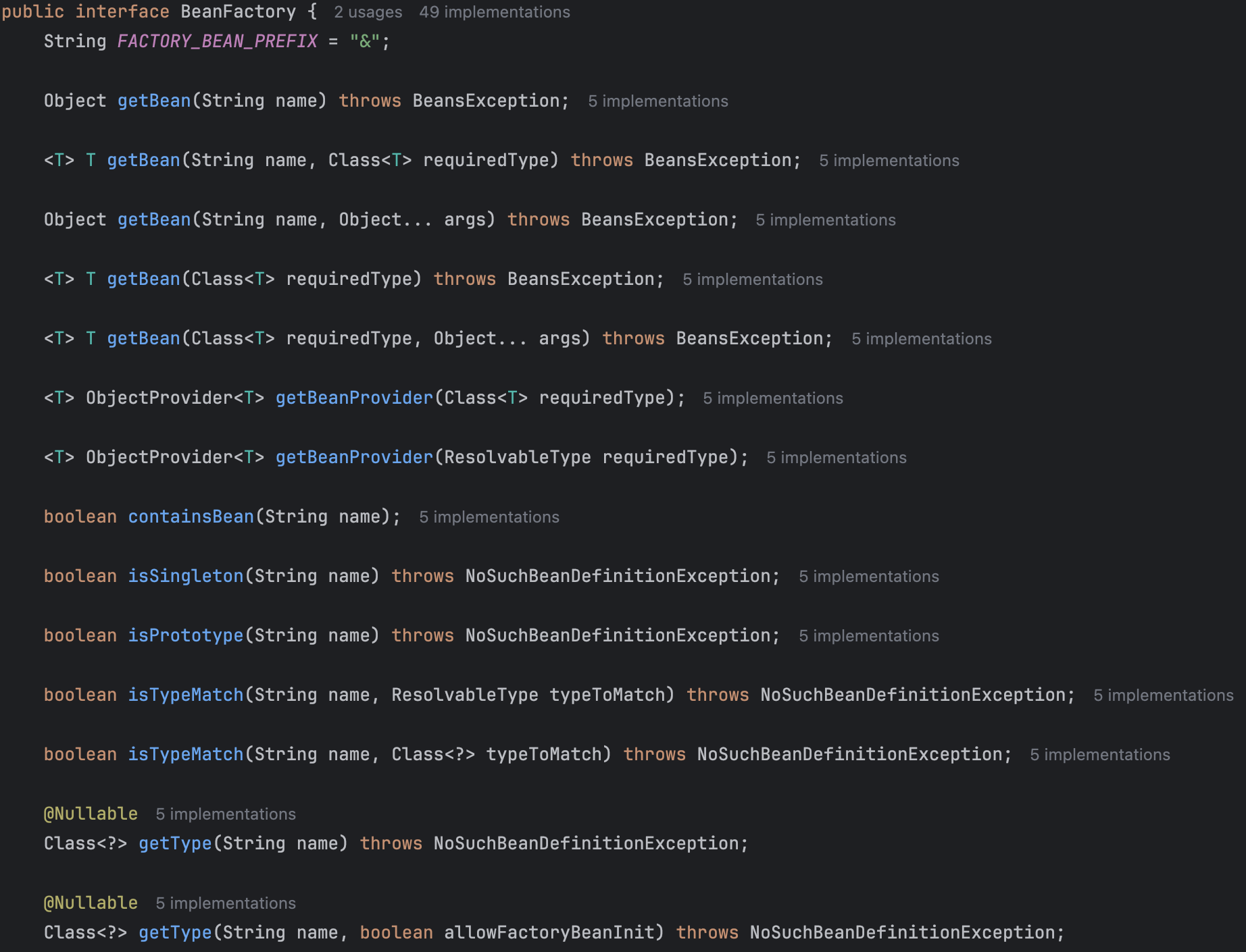 BeanFactory에는 위와 같이 빈의 이름(String)을 통해 빈 객체를 반환받는 getBean() 메서드와 빈의 생명주기를 파악하는 isSingleton(), isPrototype() 등의 메서드가 존재한다.