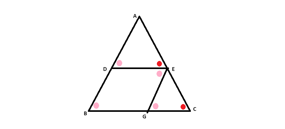 - AB와 평행하는 선분 EG를 그리면, △ADE 와 △EGC 또한 닮음 관계가 성립한다.