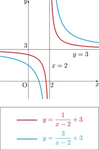 이 그래프를 x를 3만큼, y를 -2만큼 평행이동한다면, 점근선의 접점은 (3,−2) 로 이동하고 함수는 y=x−33−2 가 된다.