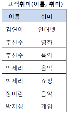 테이블 컬럼이 원자값(하나의 값)만 갖도록 분해.