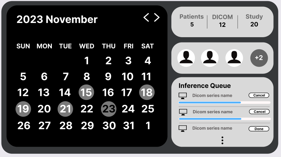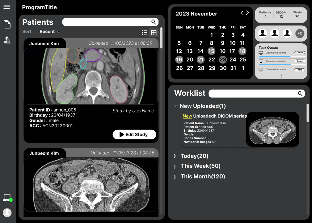 환자 리스트, 날짜별 이벤트, 데이터 관리, 서버 연결, User관리 등등 모든 기능을 함축적으로 나타내기위해 디자인했는데 조금 어수선한 느낌이 있네요.