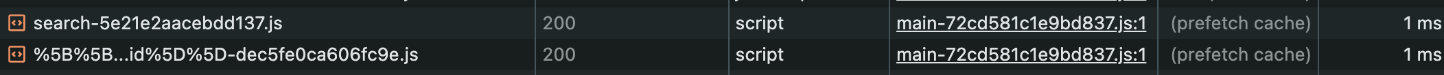컴포넌트를 통해 연결된 페이지의 JS 번들을 미리 가져와 캐싱한 모습이다. 네트워크 탭에서 prefetch cache
