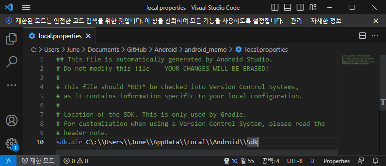 sdk.dir 값을 안드로이드 SDK의 경로로 수정