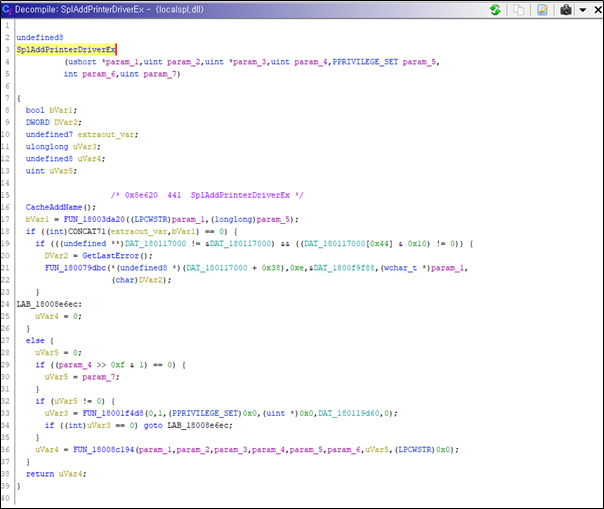 여기서 SplAddPrinterDriverEx는 param_1~7의 매개변수를 인자로 받는다. AddPrinterDriverEx함수의 매개변수 중 4번째 매개변수가 dwFileCopyFlags였으므로 param_4로 추정할 수 있다.