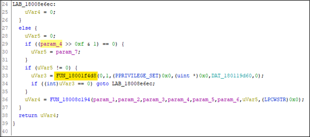 FUN_18001f4d8는 사용자가 SeLoadDriverPrivilege권한이 있는지 확인하는 기능이다. 때문에 공격자가 param_4를 통해 제어한 if문을 실행시키지 않는 것으로 해당 권한에 대한 검사를 우회하는 것 가능해진다.
