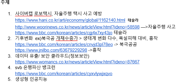 저희는 기사를 긁어보면서 자유롭게 주제를 정해서 발표를 했습니다!