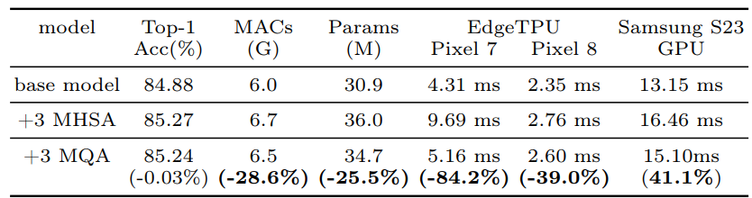 비교적 낮은 정확도 손실: Mobile MQA는 효율성을 높이기 위해 설계되었지만, 정확도 손실이 미미하다. 실험 결과에 따르면, Mobile MQA는 EdgeTPU 및 Samsung S23 GPU에서 39%의 가속을 달성하면서도 정확도 손실이 0.03%에 불과하다는 것을 보여준다.