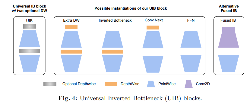 UIB는 Inverted Bottleneck (IB), ConvNext, Feed Forward Network (FFN)와 같은 여러 기존 아키텍처를 통합. 이로 인해 UIB는 다양한 기능을 수행할 수 있으며, 각기 다른 요구 사항에 맞춰 최적화된 성능을 제공.