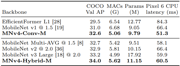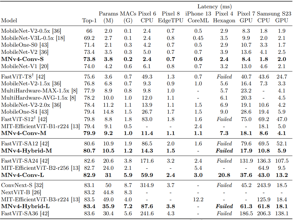 - MobileNetv4 모델은 다양한 정확도 목표와 hardware platform에서 대부분 Pareto-optimal 성능을 달성