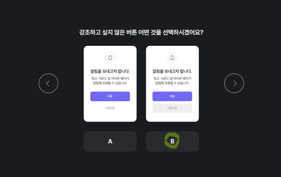 A안 같은 경우 강조하고 싶지 않은 버튼에서 박스버튼을 누를 수 있는 범위를 예측할 수 없고 버튼 조차 아니라고 생각할 수 있는 요소라고 생각하기 때문임