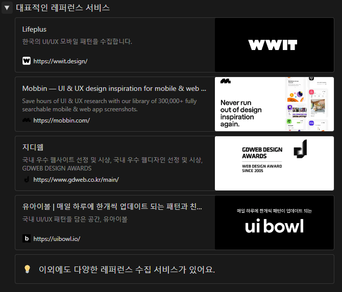 대표적인 서비스로는 mobbin(해외 서비스 위주), wwit(국내 서비스 위주), gdweb(국내 웹 위주)이 있음