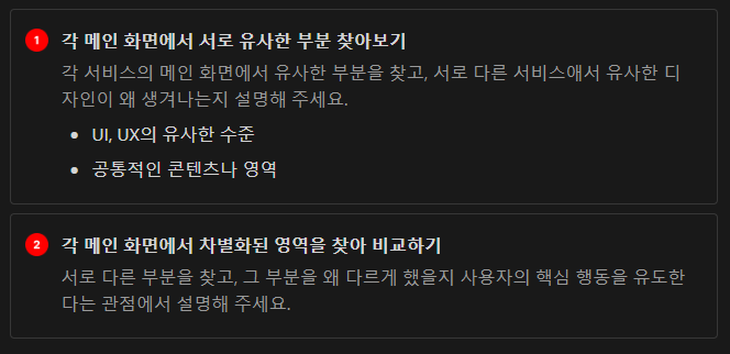 내가 디자인할 서비스 카테고리를 정한 후, 그 카테고리에서 가장 대표적인 서비스를 5~10개를 찾음