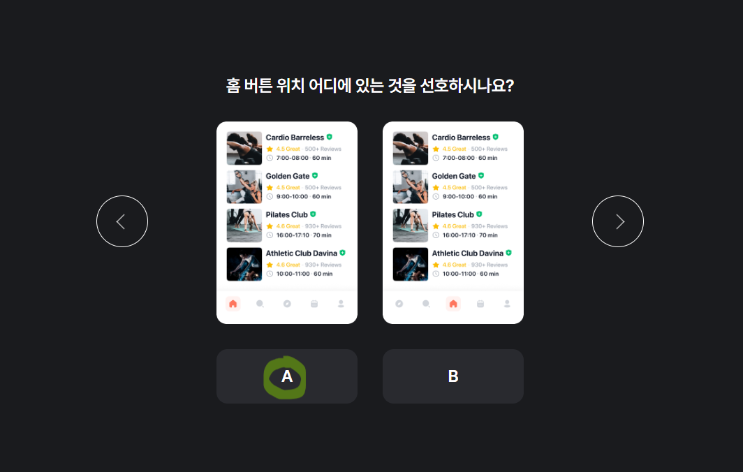 넷플릭스, 유튜브, 멜론, 인스타그램 등 주 사용앱에서 A안 처럼 배치 되어있기 때문에 A안이 더 편하다고 인식 되는 것 같음 제이콥의 법칙처럼